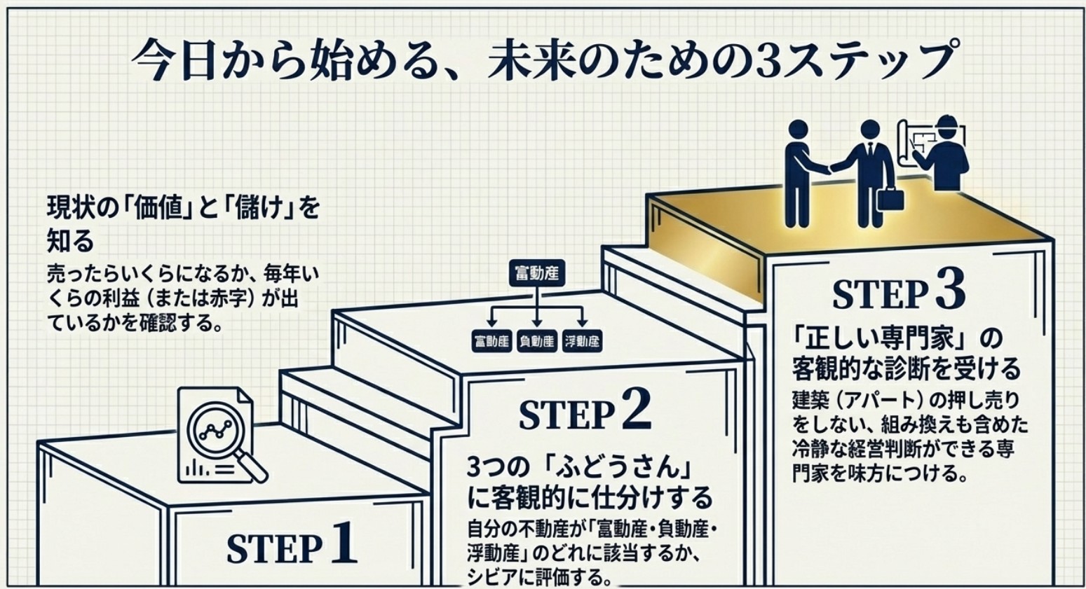 建物はいずれ古くなり、必ず「大規模な修繕」や「建て替え」という難題がやってきます。子どもたちは、そうした経営上の苦労やリスクも一緒に引き継ぐことになります。 だからこそ、親は自分が生きているうちに「この不動産はこのまま持っていて大丈夫か?」「子どもに苦労をかけないか?」を整理し、良質な状態(富動産)にしてからバトンを渡すという思いやりが大切です。
