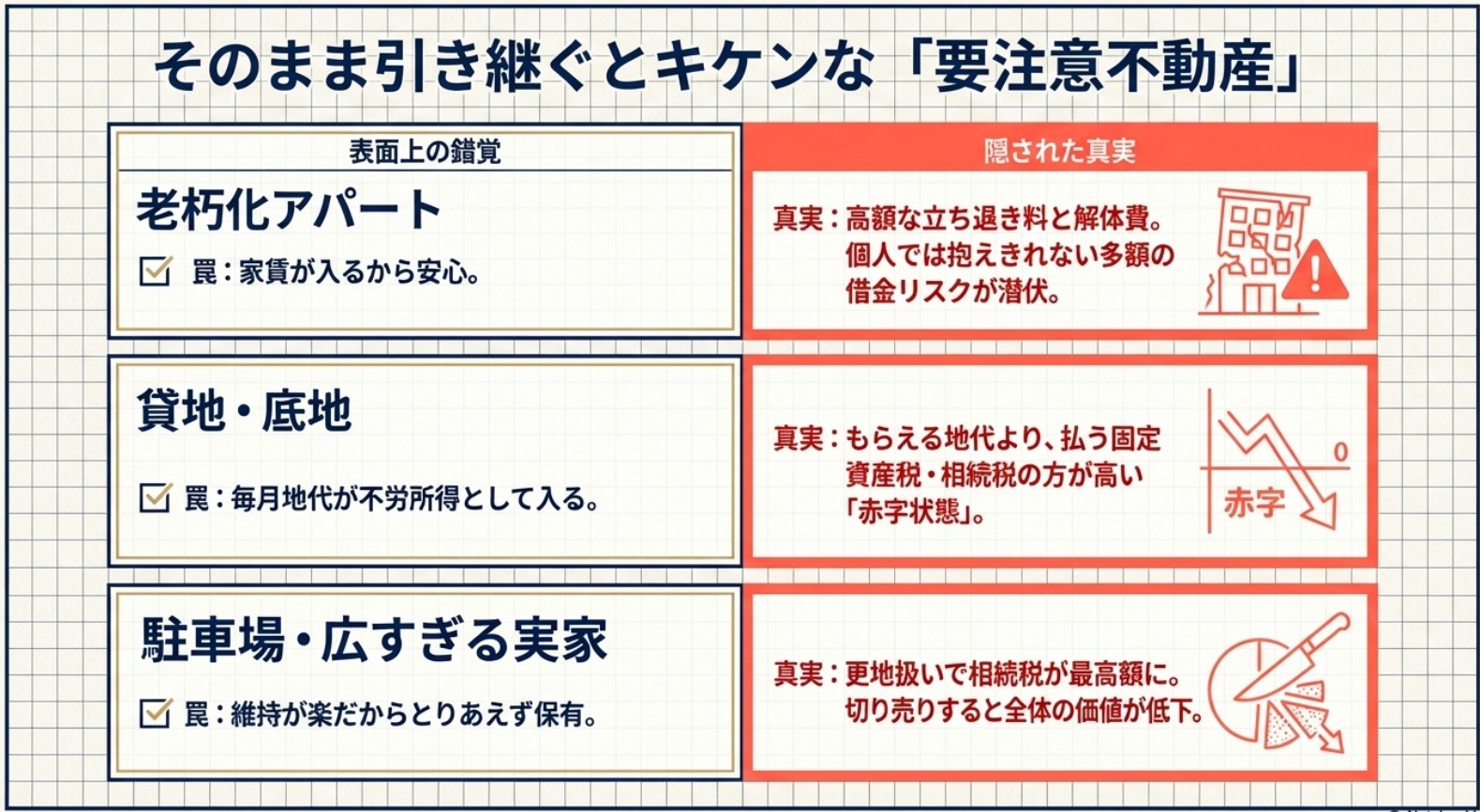 古くてリスクの高い不動産や、収益性の低い土地を、良質で稼げる不動産へとシフトしていく(売却して組み換える)。この思い切った経営判断こそが、ご家族の未来を守る最強の盾となります。