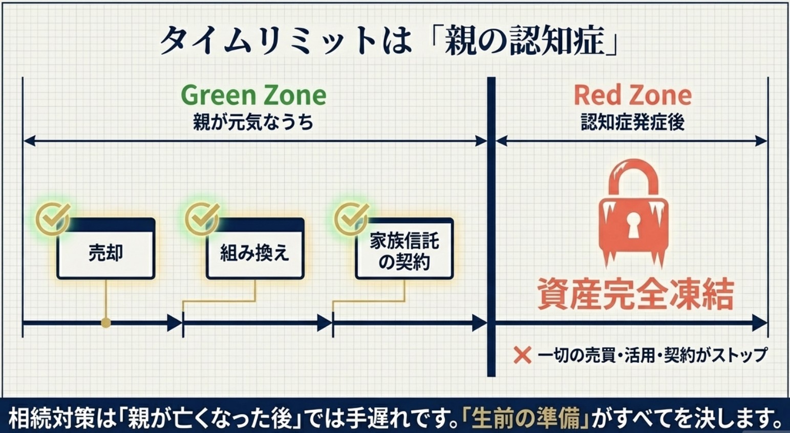 しかし、もし親が高齢になり認知症などを発症してしまうと、法律上こうした契約や判断ができなくなり、**不動産が完全に「凍結」**されてしまいます。いざという時に、売ることも活用することもできなくなってしまうのです。