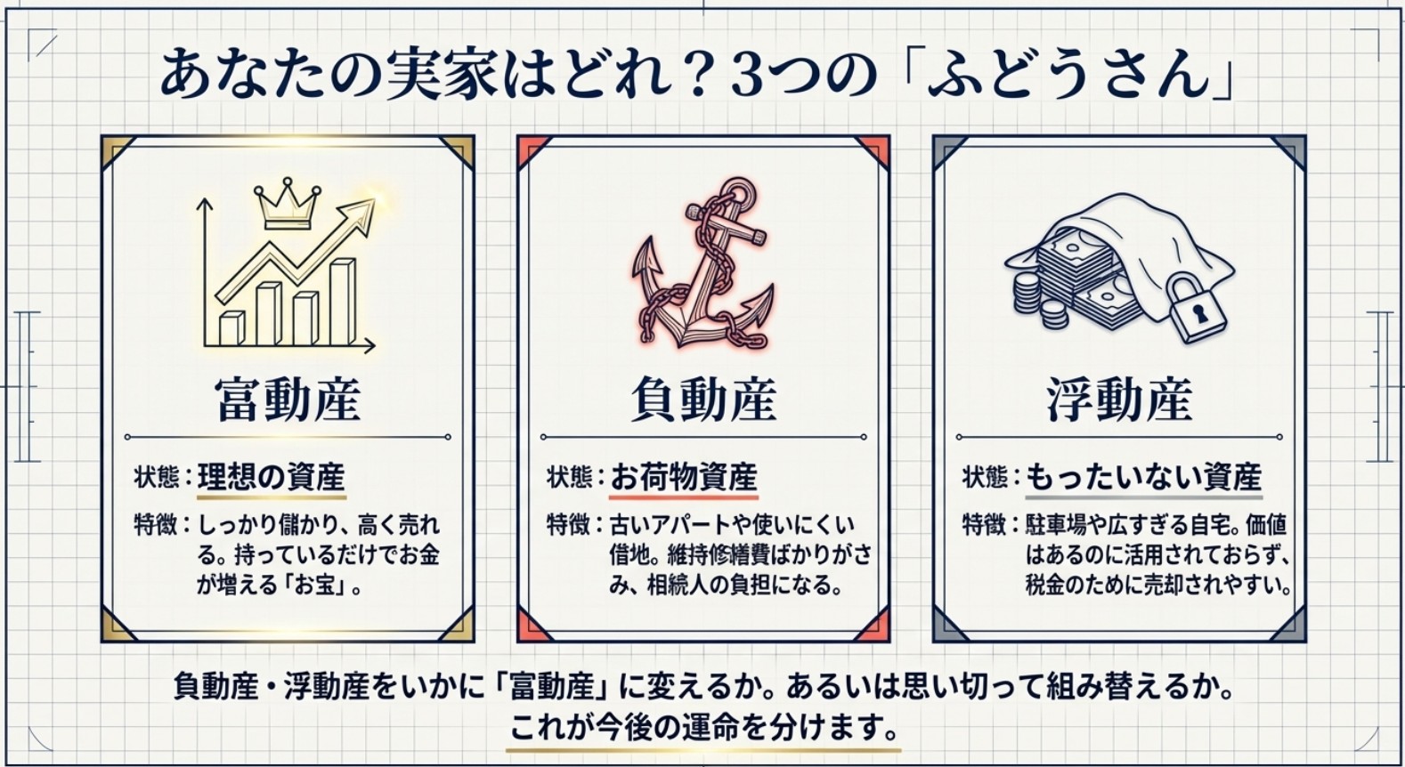 まずは、お手持ちの不動産が「負動産」や「浮動産」になっていないかを確認しましょう。それらをいかにして「富動産」へと変えていくか。あるいは、思い切って**「価値の高い別の物件に組み替える(買い替える)」**か。この判断こそが、これからの不動産相続の鍵となります。