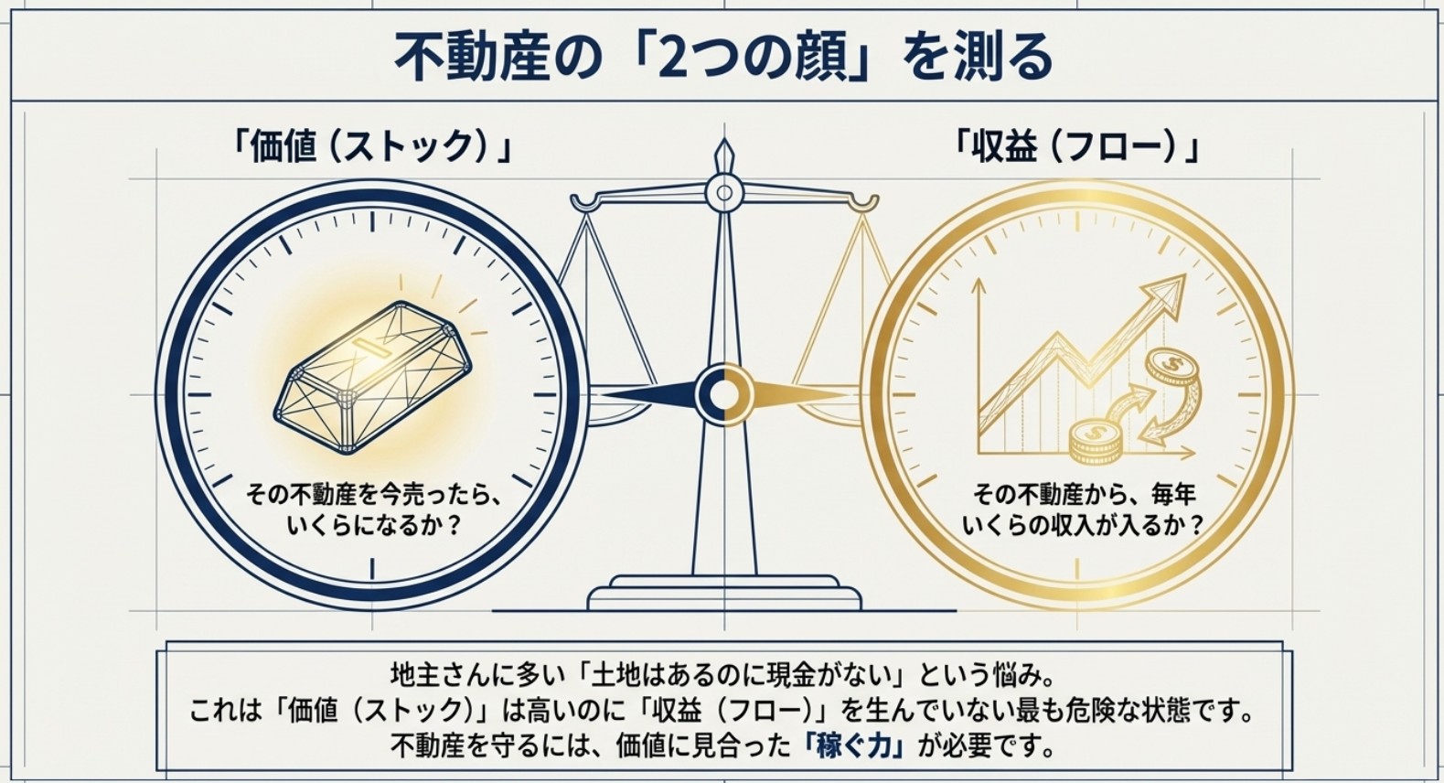 地主さんに多いのが、「土地はたくさんあるけれど、手元に現金がない」という悩み。これは「価値」は高いのに「収益」を生んでいない状態です。持っているだけで税金や維持費がかかる不動産は、放っておくと家計を圧迫するだけ。不動産を守るには、その価値に見合った**「稼ぐ力」**を持たせることが重要なのです。