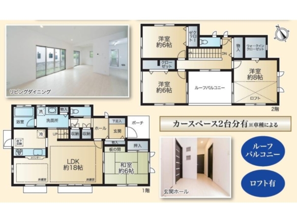 都市ガス,電気,上水道,浄化槽,システムキッチン,浄水器,食器洗浄乾燥機,給湯,追焚機能,トイレ2箇所,バス・トイレ別,温水洗浄便座,洗面所,洗面台,室内洗濯機置場,浴室乾燥機,バス1坪以上,床暖房,ロフト,フローリング,ルーフバルコニー,庭,24時間換気システム,収納スペース,ウォークインクローゼット,床下収納,駐輪場,バイク置き場,駐車場2台分,ディンプルキー,モニター付きインターホン